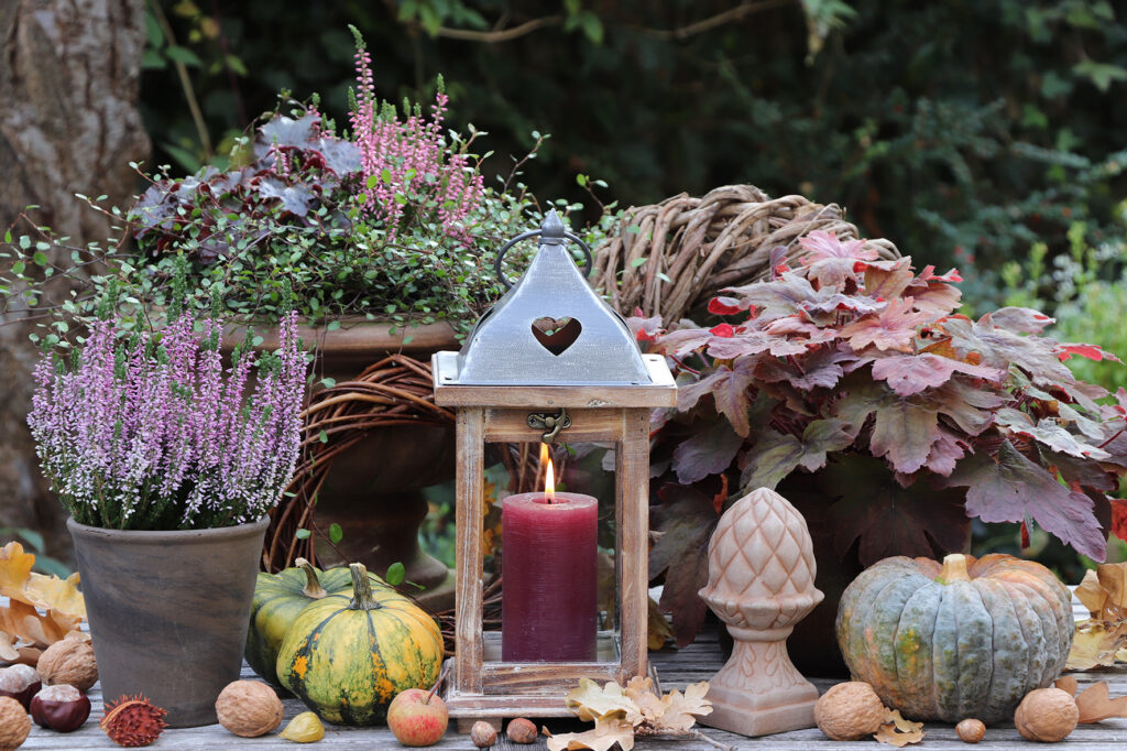 Fyll din trädgård med värme och stillhet under Allhelgona genom att tända lyktor och ljus som mjukt lyser upp gångar, entréer och träd i höstmörkret. Skapa liv med vackra vinterplanteringar – byt ut sommarens blommor mot tåliga växter som ljung, silverek och alunrot i grupperade krukor och urnor. Låt naturens skatter ta plats i dekorationerna: mossa, grenar, kottar, nypon och pumpor ger en jordnära känsla. En krans eller ett hjärta av granris blir pricken över i – lika vackert vid entrén som på gravplatsen.